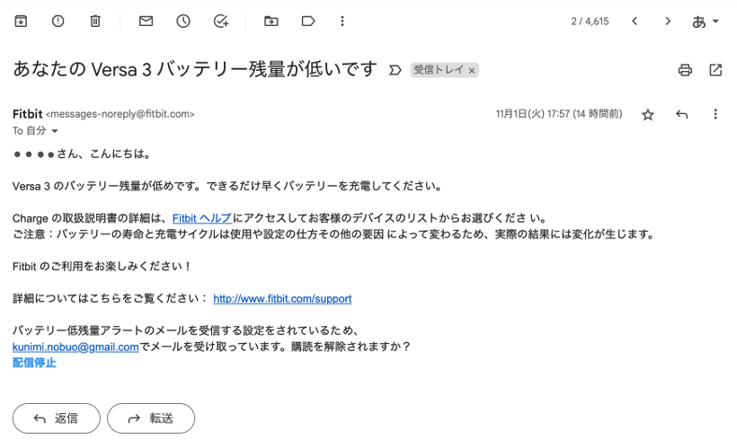 メーカー「Fitbit」からのメールで『バッテリーの残量が