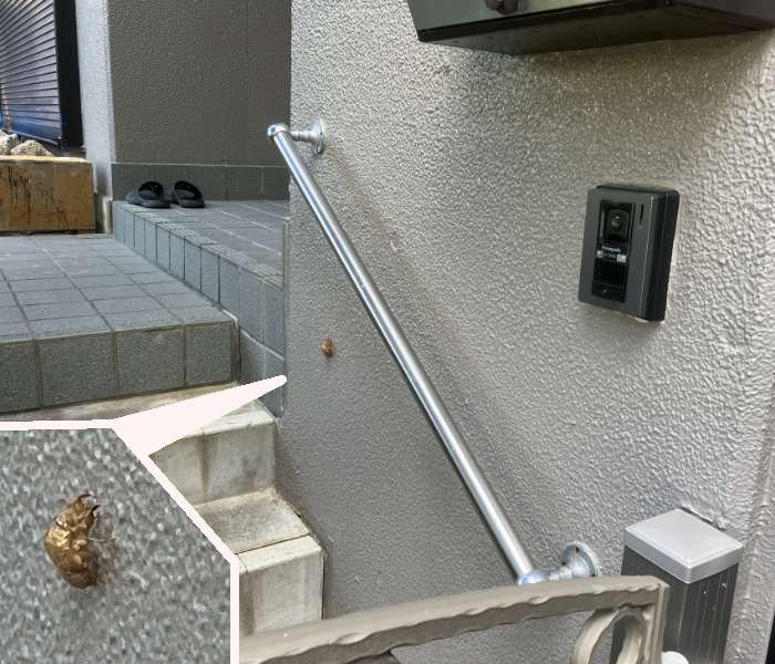 玄関横の壁に「羽化」した後の「セミの抜け殻」がとまっている