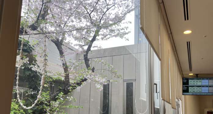 日赤病院の待合室横の中庭に咲いている桜の花も、そろそろ終わりが近づいているのか、少しの風でも、花びらが舞い落ちる。