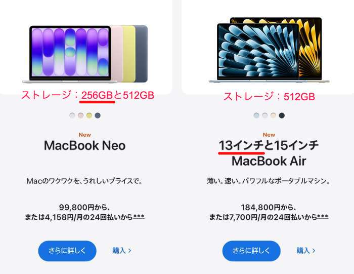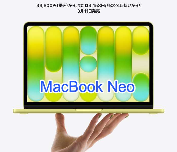 そして つい先日のこと、「MacBook Neo」という名前の廉価版が、3月11日に99,800円という値段で発売の予定だそうで、その予約の注文を受け付けている・・とあった。