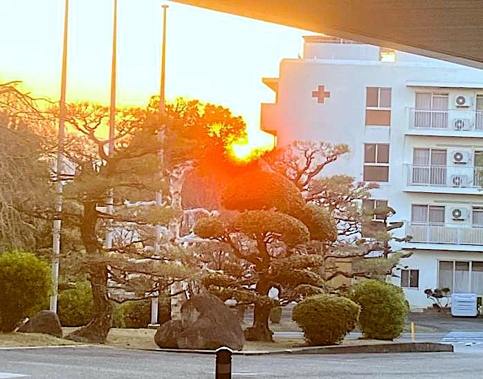 つれあいが 今月受けていた7日間の点滴治療を終えて 病院の外に出ると、西に沈む夕日が 眩しかった。